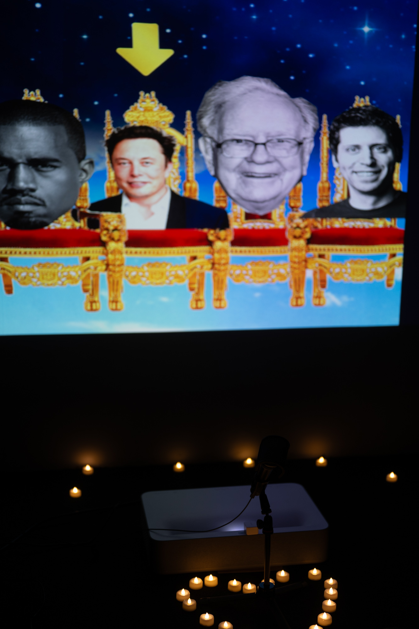 Participants are asked to bow down and praise modern-day kings, exposing the absurdity of our continued reverence for a new form of unjust, technologically-empowered nobility.